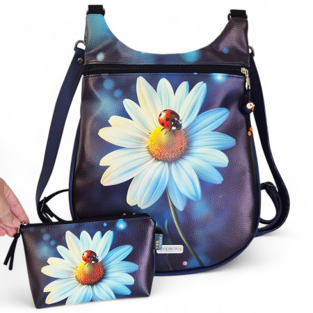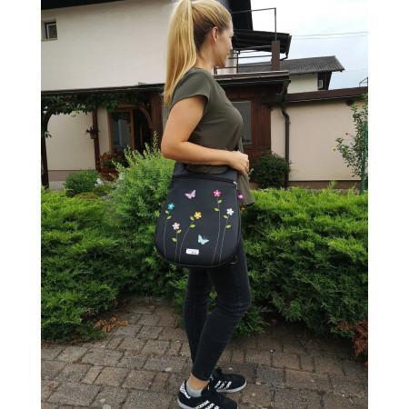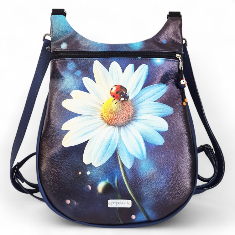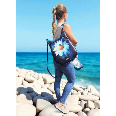 Nahrbtnik, ki se v hipu lahko spremeni v čudovito torbico in je primeren za vsak dan in prosti čas. Je dovolj velik, da vanj lahko pospraviš tudi A4 format (prostora je za nekaj zvezkov). Odpira se z zadrgo, v notranjosti pa ima žepek z zadrgo. Dodaten žepek na zadrgo ima še na zadnji, skriti (hrbtni) strani . Nahrbtnik je dodatno utrjen z všito medvlogo ter zato kompakten na otip.
